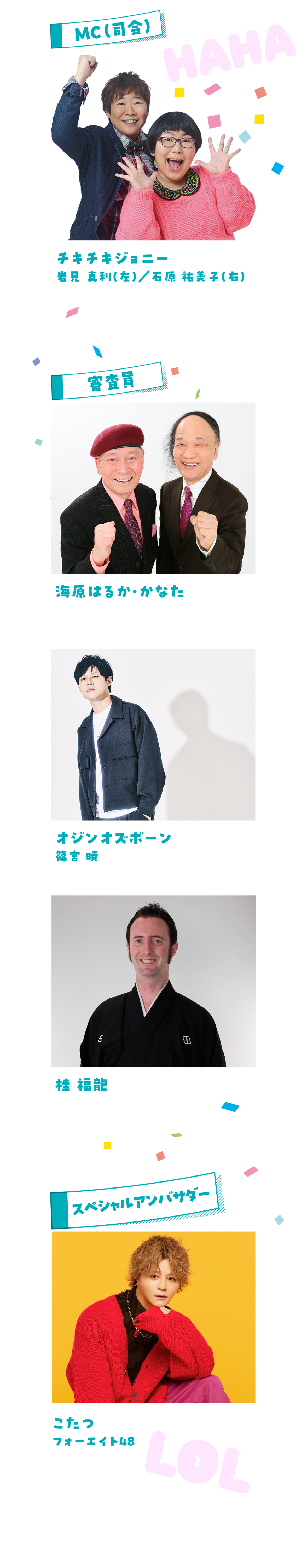 応募いただく動画・台本は、応募者本人(コンビ)によるオリジナル作品であることを原則とします。万が一、既存の著作物(例:漫才ネタ・キャラクターなど)を一部使用する場合は、必ず著作権者の許可を得た上でご応募ください。応募作品に関する第三者とのトラブルについて、主催者は一切の責任を負いかねます。応募いただいた動画・台本・写真などは、本コンテストの広報・記録・報告活動(例:公式サイトやSNSでの紹介)に使用させていただく場合があります。これに同意の上でご応募ください。